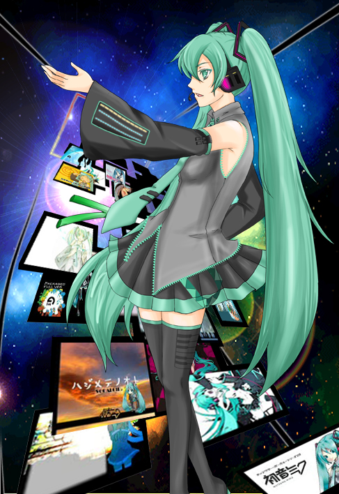 背景卡了很久,开始就决定是宇宙风啦,五线谱啦之类……发展到现在这样是偶然吧-v-b……大概是因为Melody那个3DPV里,那个神场景的影响……以及Miku的消失那首听着暴走感比较强就干脆暴走了[……]
